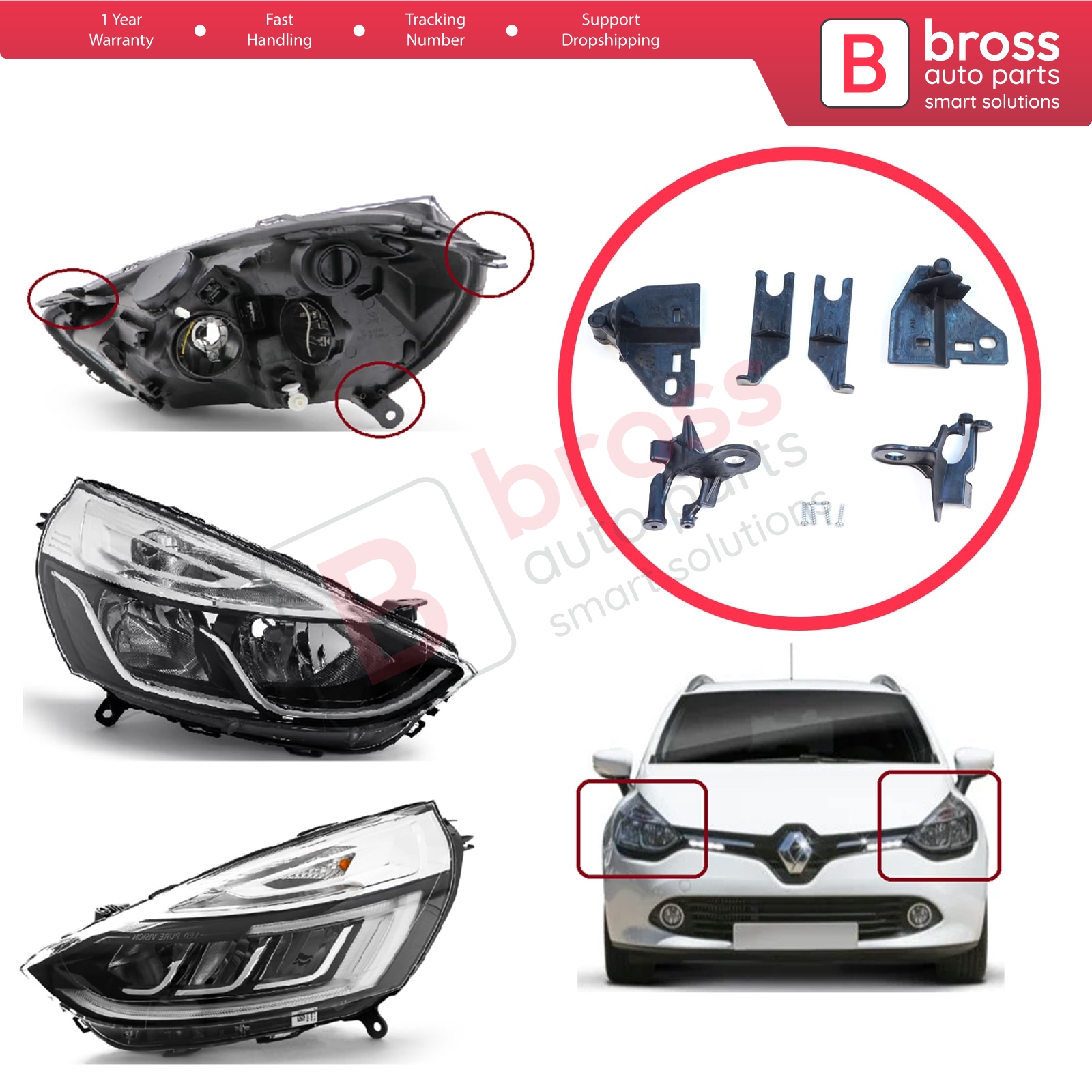 Car Headlight Headlamp Housing Repair Mount Holder Bracket Tab Clips Kit Left and Right Side for Renault Clio MK4 BH KH Estate HB Van 2012-2020 260603442R 260106624R