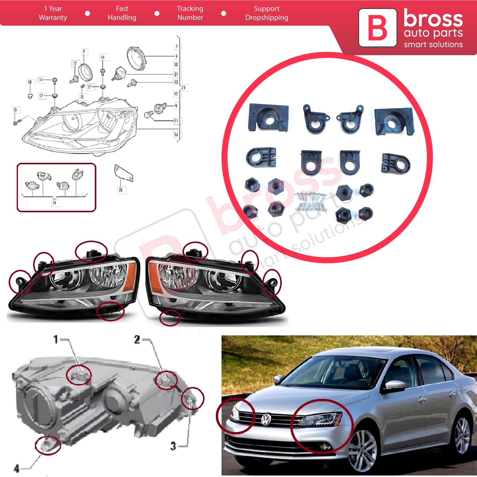 Car Headlight Headlamp Housing Repair Mount Holder Bracket Tab Clips Kit Left Right Side for VW Jetta MK6 A6 5C6 2010-2018 5C7998225 5C7998226
