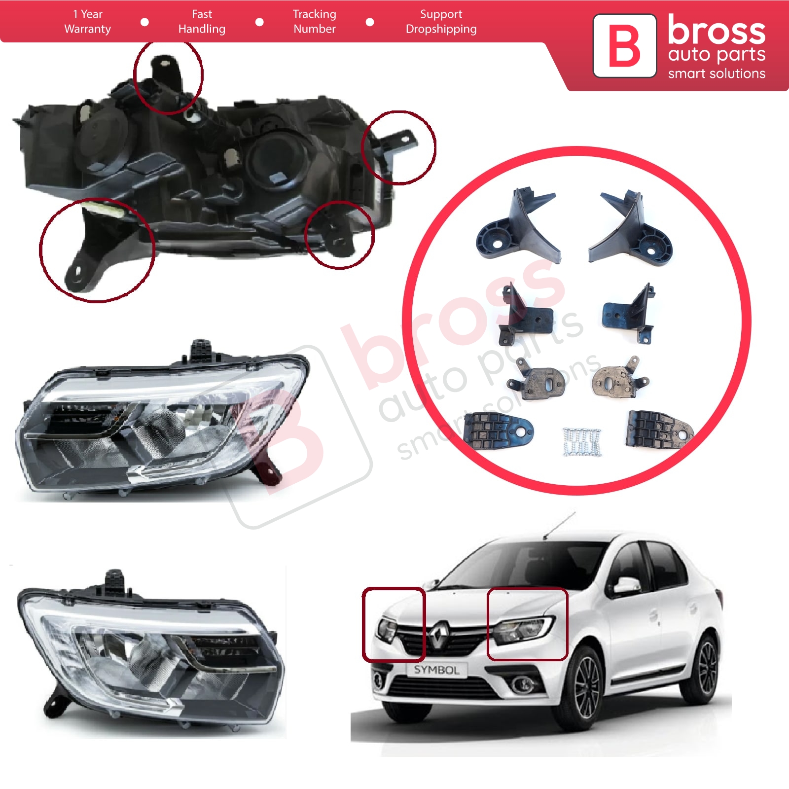 Car Headlight Headlamp Housing Repair Mount Holder Bracket Tab Clips Kit Left and Right Side for Renault Symbol MK3 Facelift 2017-On 260609154R 260102037R